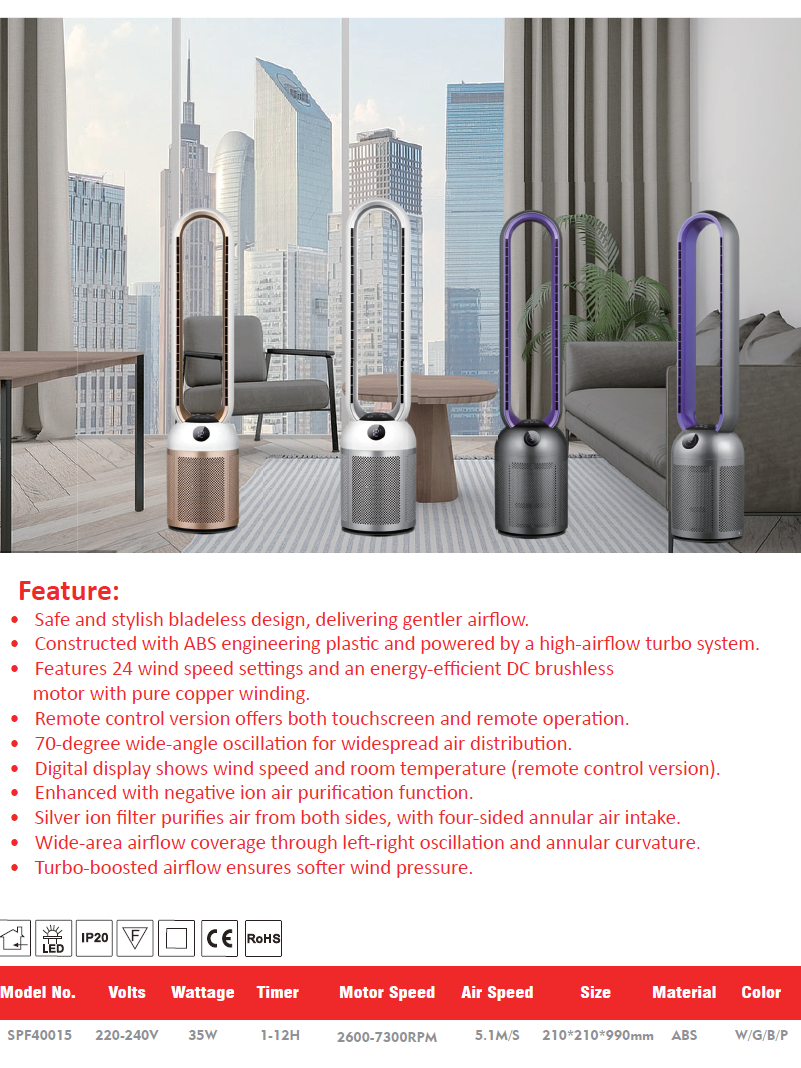 Safe and stylish bladeless design, delivering gentler airflow.Constructed with ABS engineering plastic and powered by a high-airflow turbo system.Features 24 wind speed settings and an energy-efficient DC brushlessmotor with pure copper winding. Remote control version offers both touchscreen and remote operation. 70-degree wide-angle oscillation for widespread air distribution. Digital display shows wind speed and room temperature (remote control version). Enhanced with negative ion air purification function. Silver ion filter purifies air from both sides, with four-sided annular air intake. Wide-area airflow coverage through left-right oscillation and annular curvature. Turbo-boosted airflow ensures softer wind pressure.